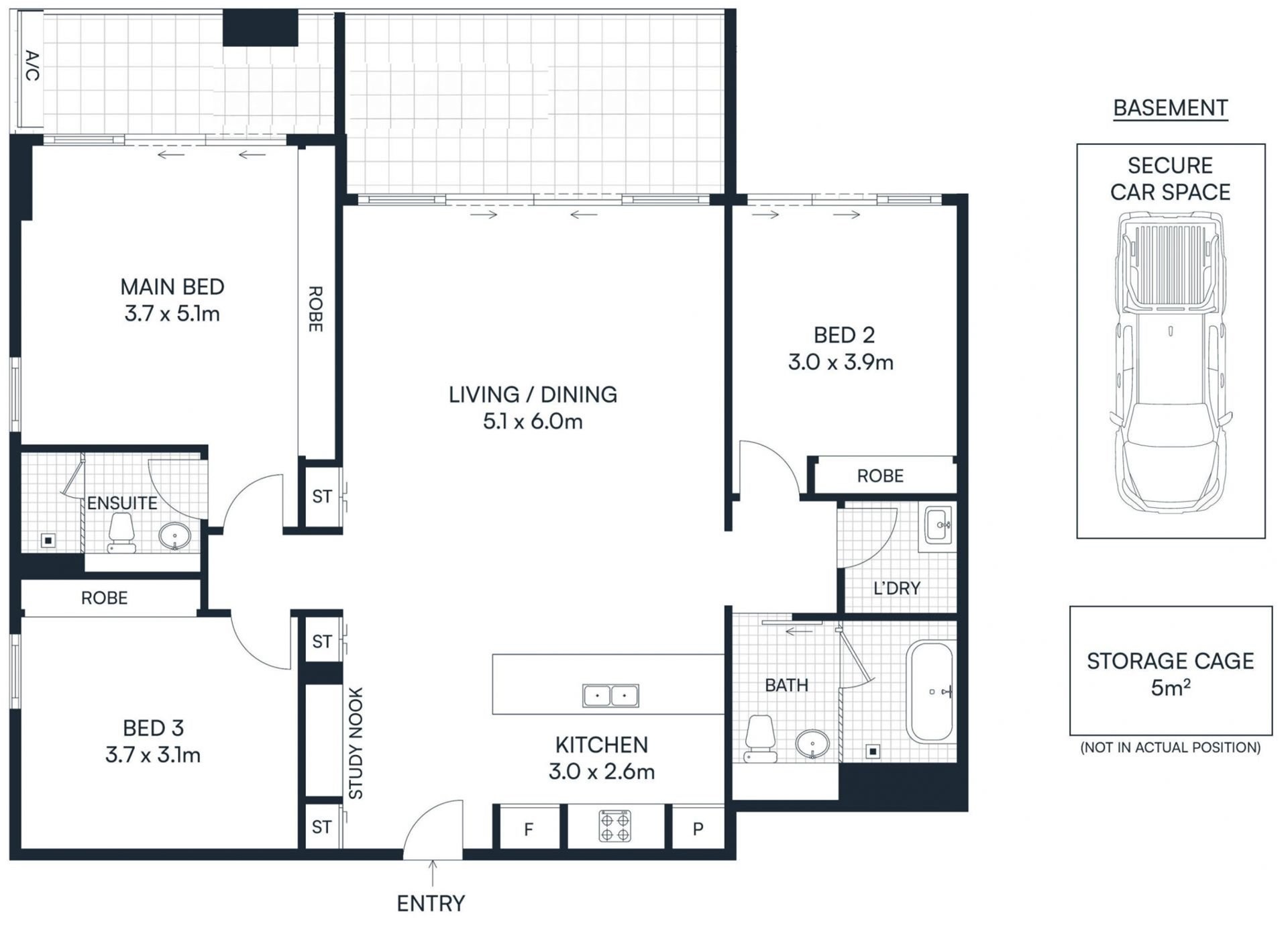 110sqm, 1 ensuite, 2 bathrooms, 1 large carpark secured space underground