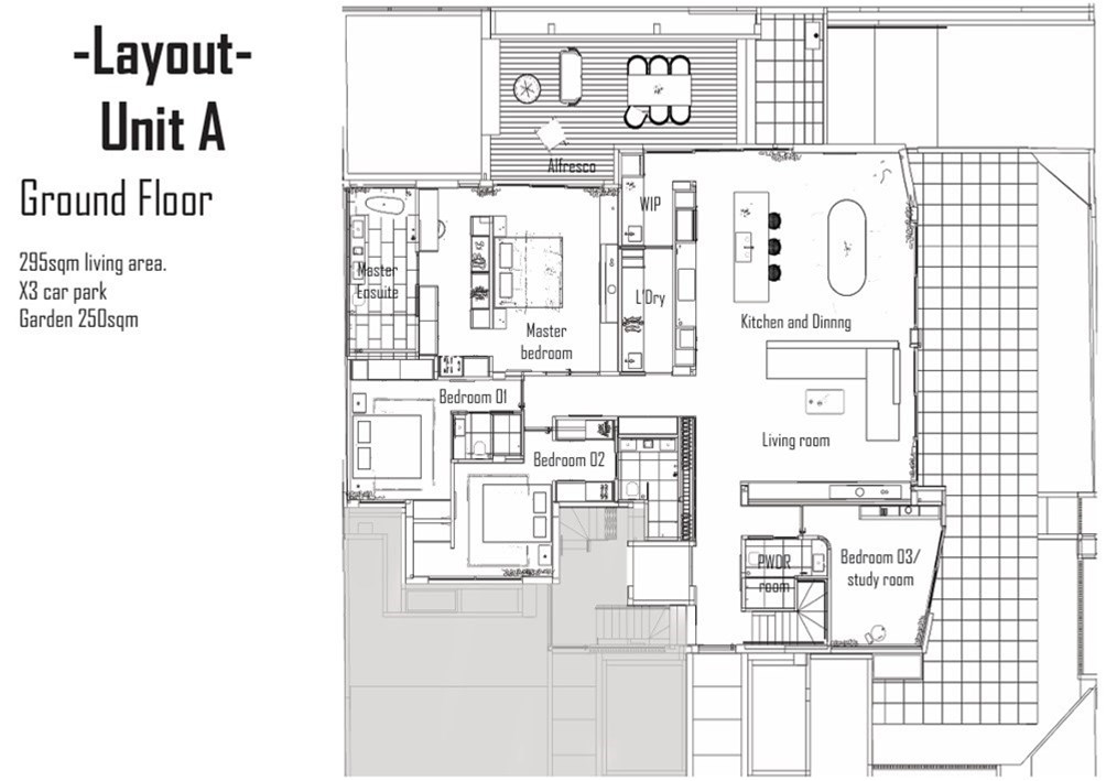 The underground level boasts a luxurious and spacious car park, providing secure and convenient access to your home. Additionally, this level offers a versatile space that can be transformed into your private cinema or a state-of-the-art gym, perfect for indulging in your personal well-ness or entertainment needs.