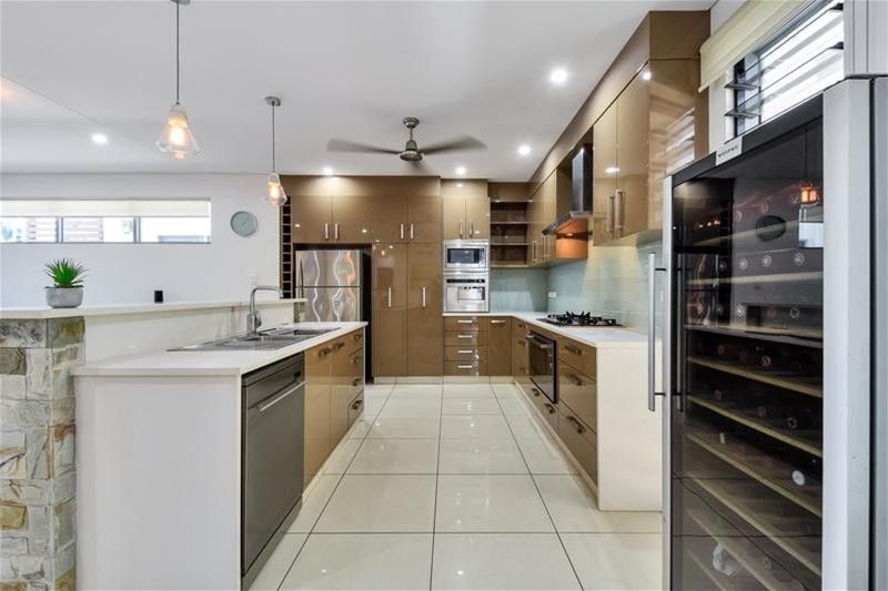 Gourmet kitchen, S/S appliances, and an island bench with feature stone frontage and stone-topped servery.